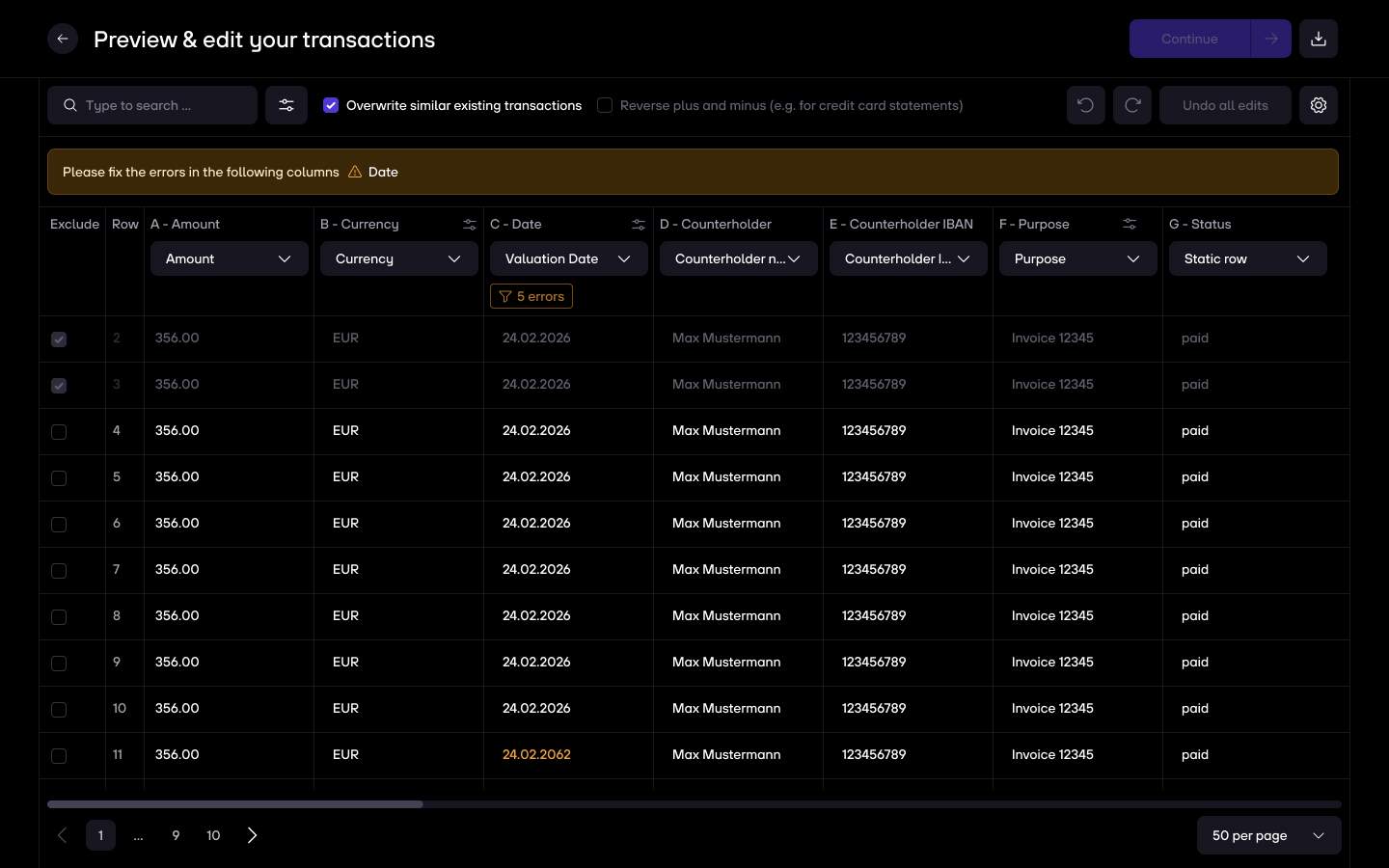 • Overwrite similar existing transactions (useful when you want to correct a previous upload which contained mistakes, or want to avoid accidental transaction duplicates). Enabled on default.