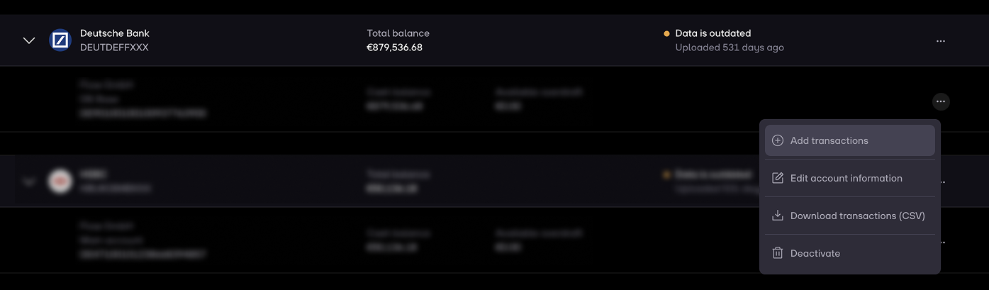 1. Click on Add transactions behind the bank account name.