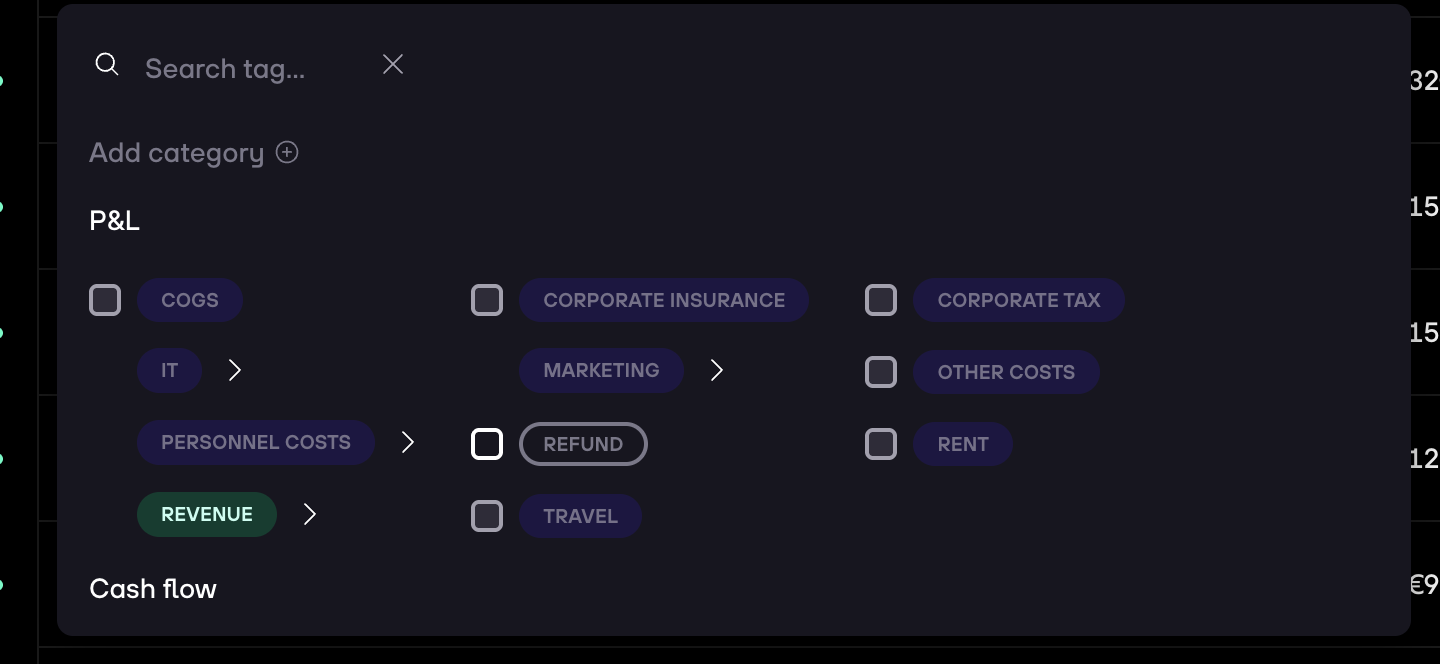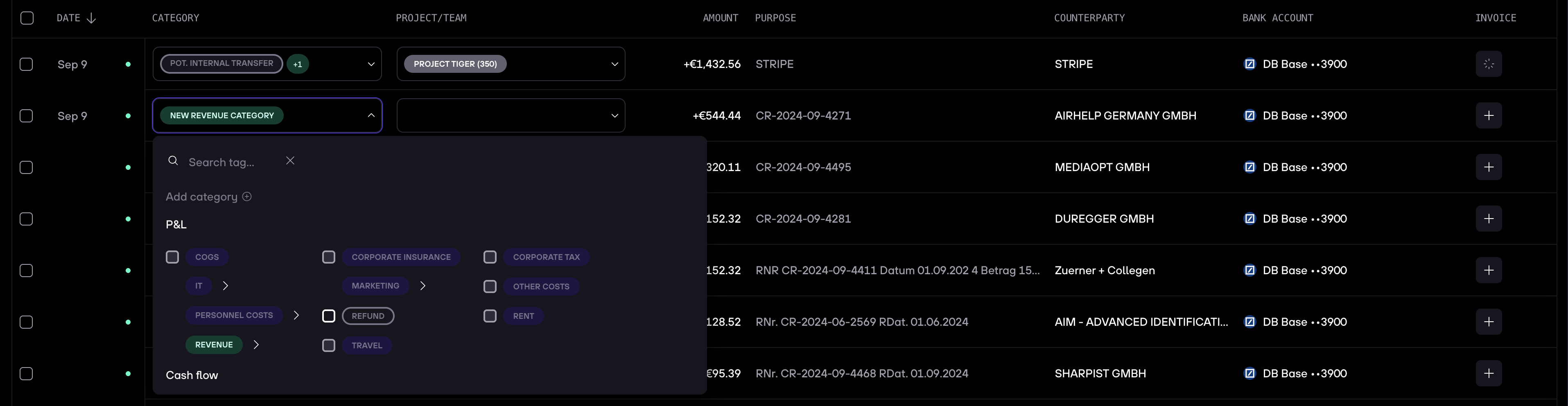 Example: You change a wrongly assigned transaction from "Other expenses" to "Marketing". Our model learns from this and applies the new pattern to similar transactions. For example, all future payments to the same vendor.